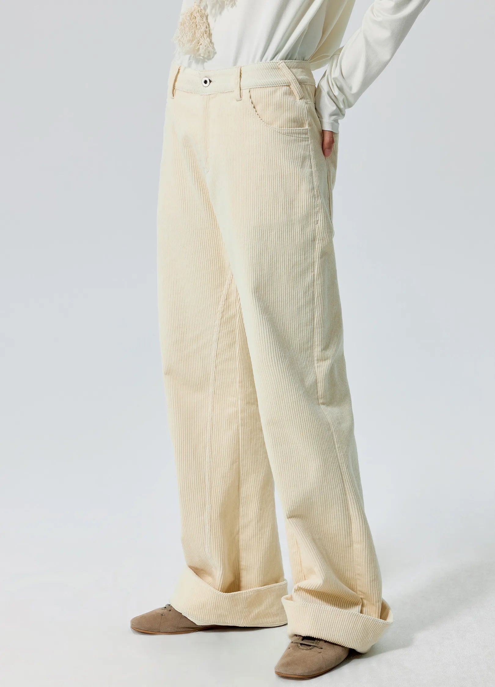 Slanted side belt loop detailing