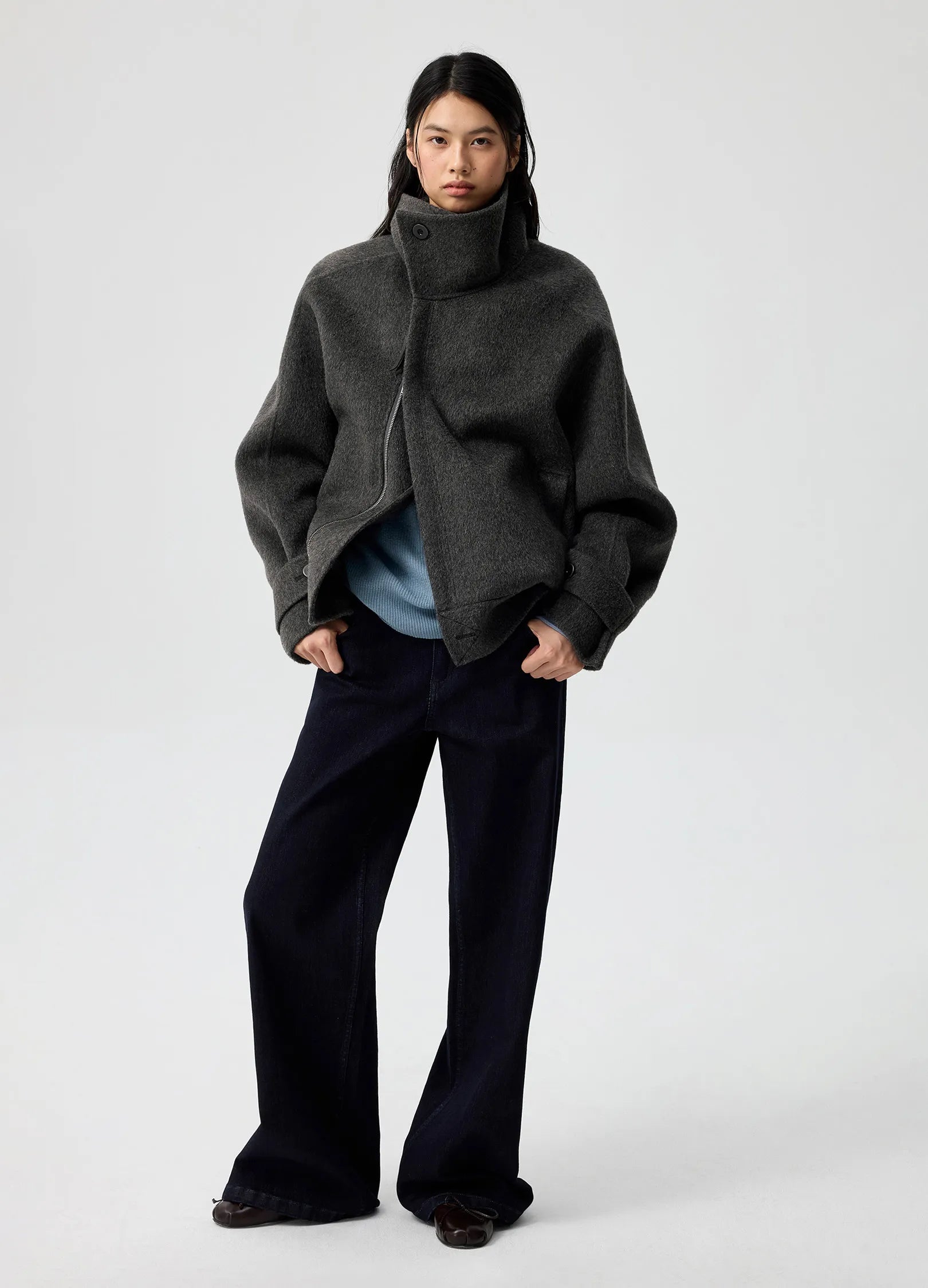 Off-center two-way zip placket